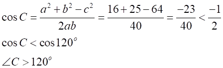 GivenSides of a triangle are 4, 5 and 8 unitsFormula UsedCosine Rule of trianglecalculationLet in a triangle , , then the greatest angle will .