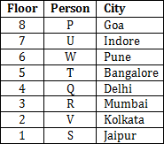 P, Q, R, S, T, U, V and W live on eight different floors of a building but not necessarily in the same order. The lowermost floor is numbered 1 and the topmost floor of the building is numbered 8. Each of the people likes different Cities viz, Mumbai, Delhi, Jaipur, Goa, Bangalore, Pune, Kolkata and Indore but not necessarily in the same order.