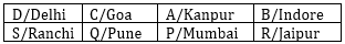 Eight persons from different cities, viz Jaipur, Mumbai, Pune, Delhi, Kanpur, Goa, Ranchi and indore, are sitting in two parallel rows containing four persons each in such a way that there is an equal distance between adjacent persons. In row 1, P, Q, R and S are sitting and all of them are facing north. In row 2, A, B, C and D are sitting and all of them are facing south. Therefore, in the given seating arrangement each member sitting in a row faces another member of the other row. (All the information given above does not necessarily represent the order of seating as in the final arrangement)